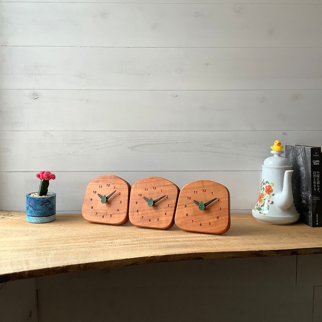 経年変化の色合いが渋いブラックチェリー。 3つご購入いただくといわゆる三連時計としてもご利用いただけます。 葉っぱの形の秒針がチョコチョコ愛らしく動きます。 ※ギフトラッピングご希望の方は備考欄にご記入ください。 サイズ:それぞれ13×16、5×7cm(縦×横×奥行き) 材:ブラックチェリー 仕上げ:天然オイル 付属品:単3電池1個 名前や日付などの文字彫り加工も可能です。 ご希望の方は「名入れ加工」をオプションでお選びいただき 備考欄に彫る内容をご記入ください。 例)裏に 2017.6.9 tarou & hanako 「修理について」 念入りに試運転してから発送しておりますが 万が一不具合がございましたらご連絡下さい。 時間を合わせる際は、機械に付いているダイアルでお願いします。 針の部分はデリケートに出来ておりますので 直接針をおさわりにならないようお願い致します。 何年後でありましても修理は基本的に無料で行っております。 連絡先を作品に同封いたしますのでお気軽にご連絡下さい。 (送料はご負担いただいております)